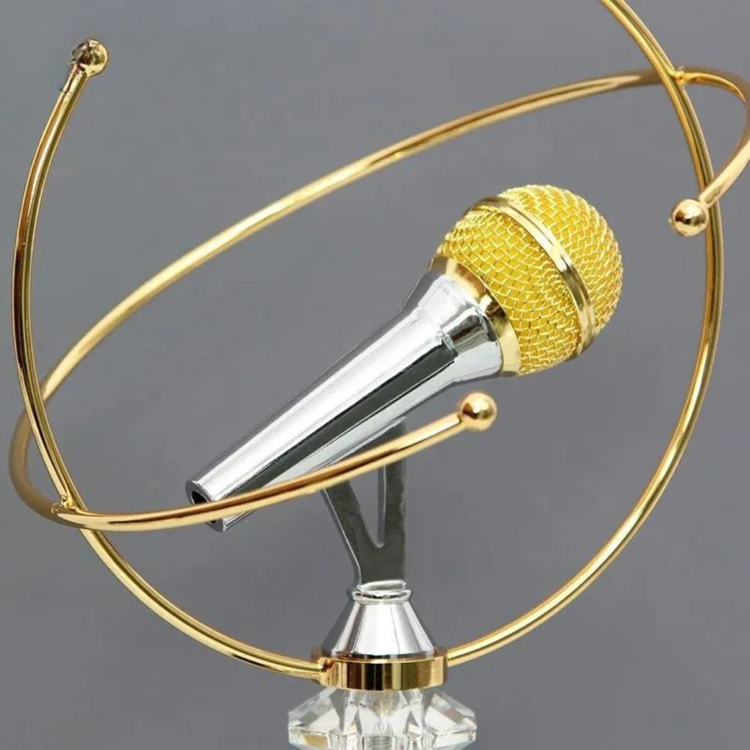 Diese moderne Mikrofon Skulptur verkörpert Eleganz und Kreativität zugleich. Inspiriert vom Glanz großer Bühnen, kombiniert sie ein goldenes Mikrofon mit einem edlen schwarzen Marmorsockel – ein Symbol für Erfolg und Ausdruckskraft.