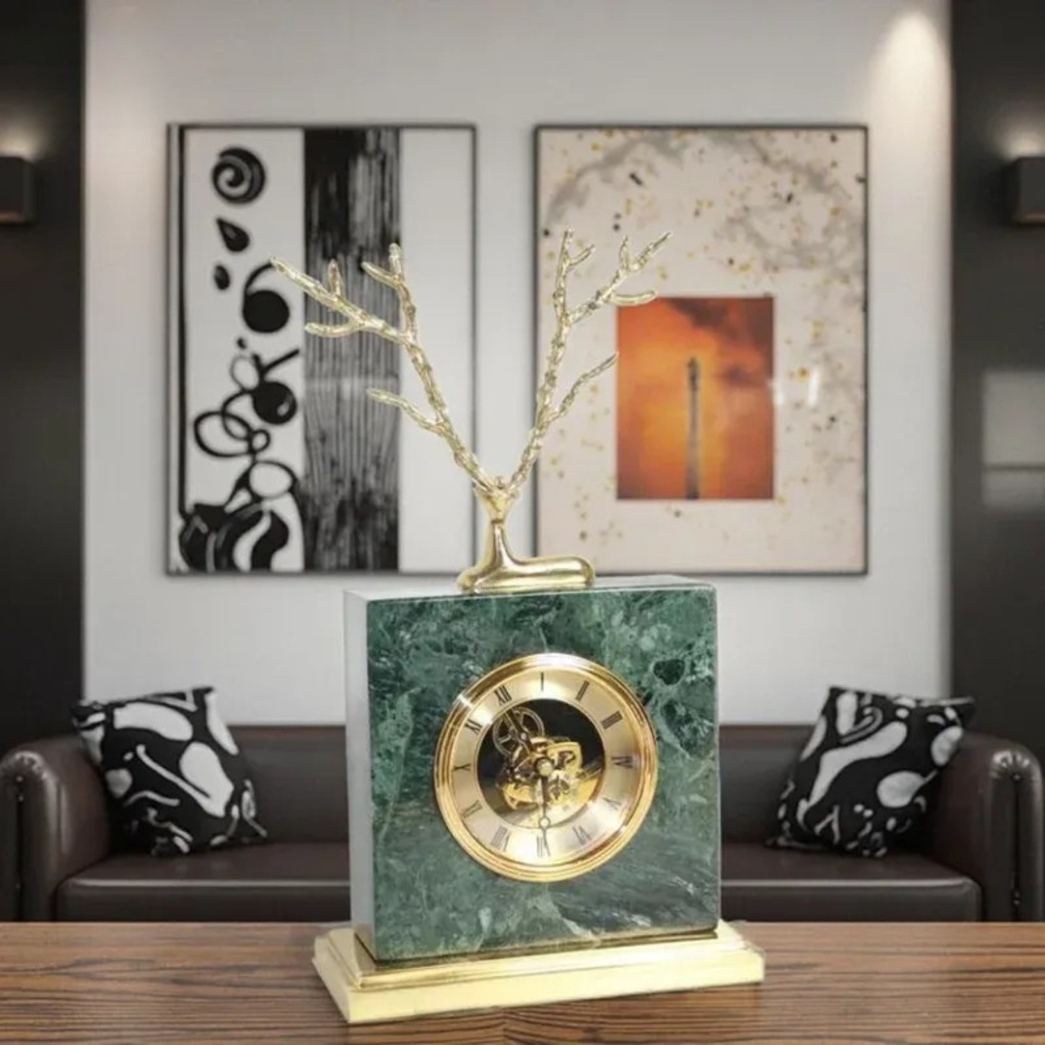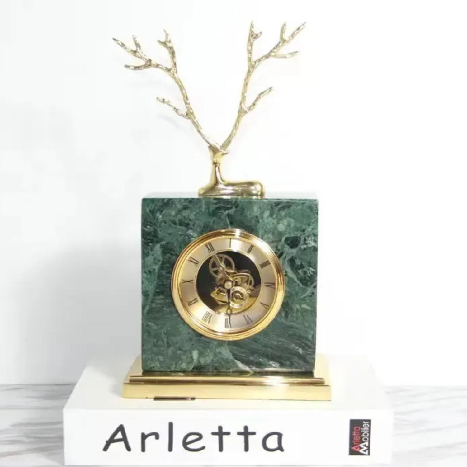 Diese exklusive Tischuhr mit goldenem Hirschkopf-Design verkörpert Eleganz, Stil und symbolische Stärke.