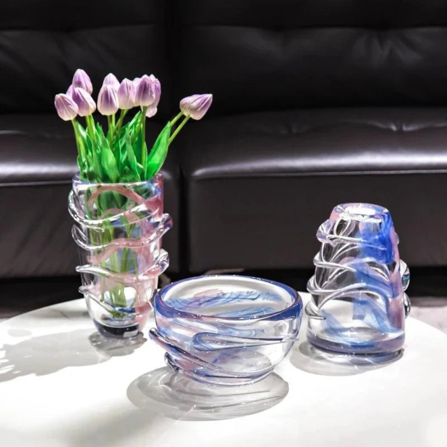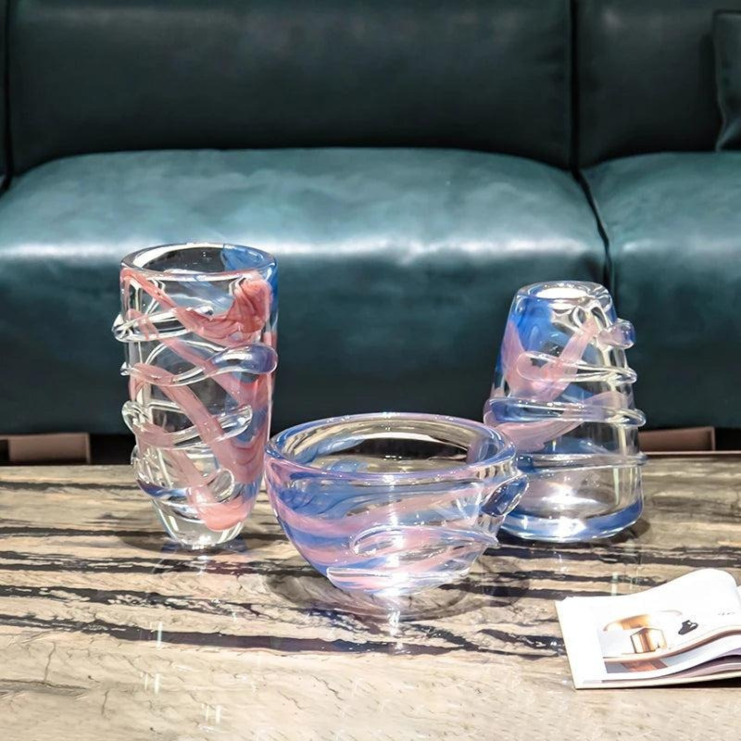 Keywords: Kunstglasvase, handgefertigte Vase, moderne Dekoration, Designer Glas, Glasvase bunt, Blau Rosa Glas, Luxus Wohnaccessoire, Centerpiece, Interior Design, Unikat Vase, Kristallglas, Glas Dekoration, modernes Wohnen, Wohnkultur, handgeblasenes Glas, Dekorative Vase, Tischdekoration