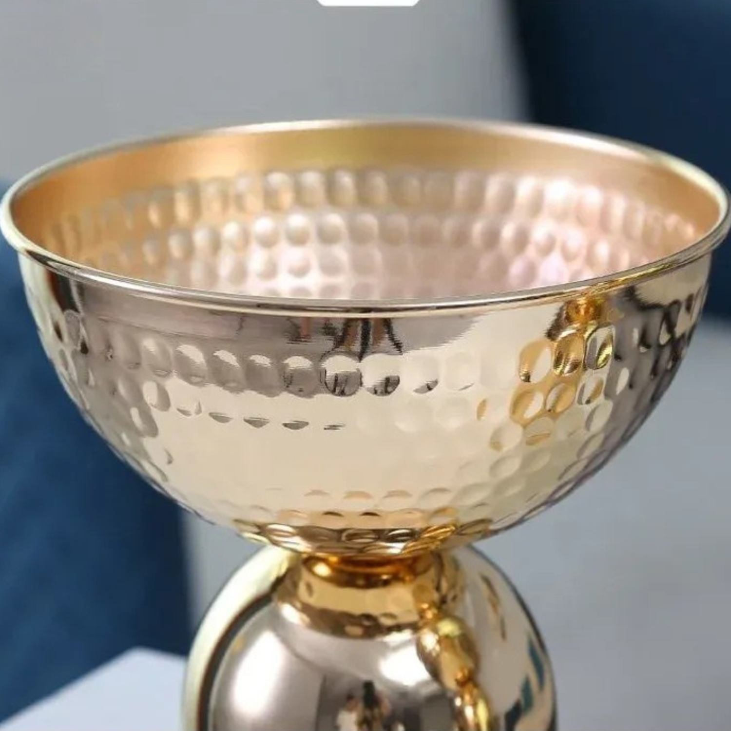 Gefertigt aus hochwertigem, gehämmertem Metall in glänzendem Goldton, strahlen die Schalen Eleganz und Leichtigkeit aus.