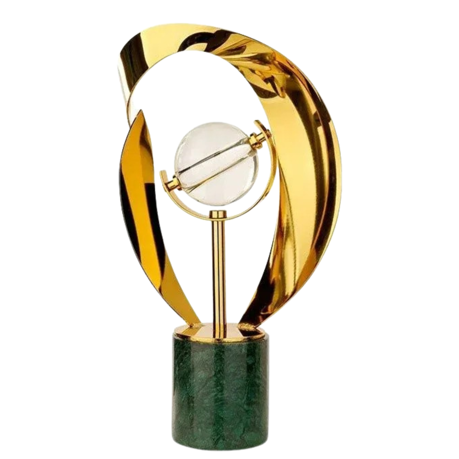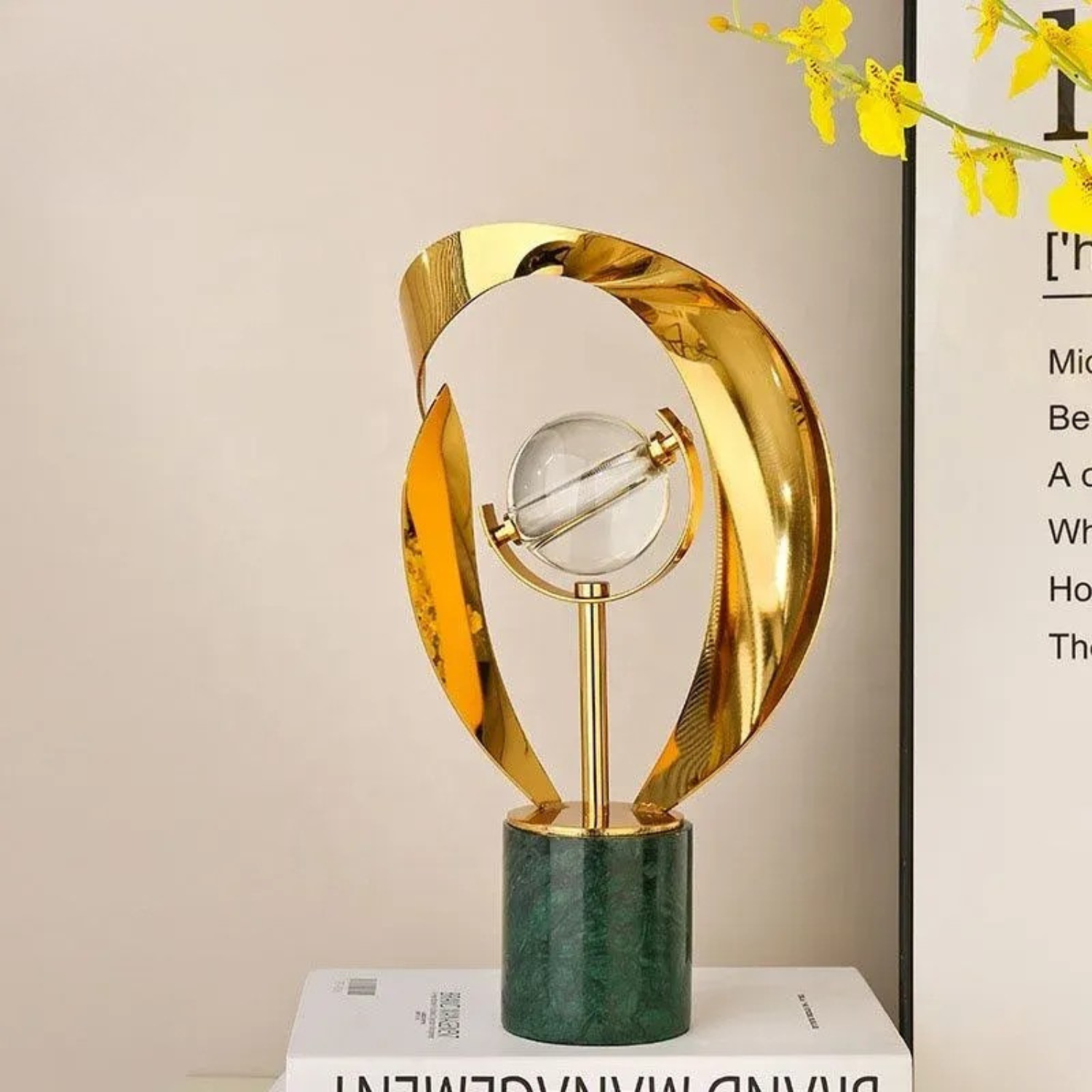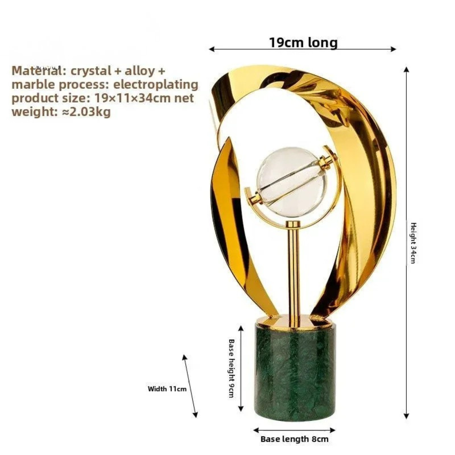 Diese moderne Kristall Dekofigur besticht durch ihre transparente Glaskugel und goldene Metallstruktur, die Eleganz und Kreativität vereinen. Der stabile Marmor-Sockel sorgt für sicheren Stand, während das Design Licht und Luxus in jeden Raum bringt.