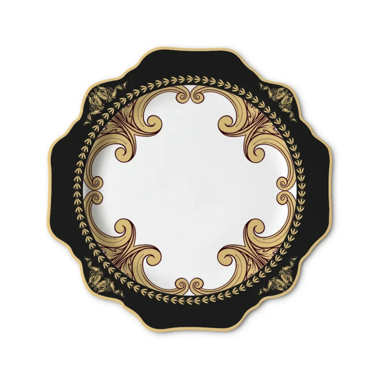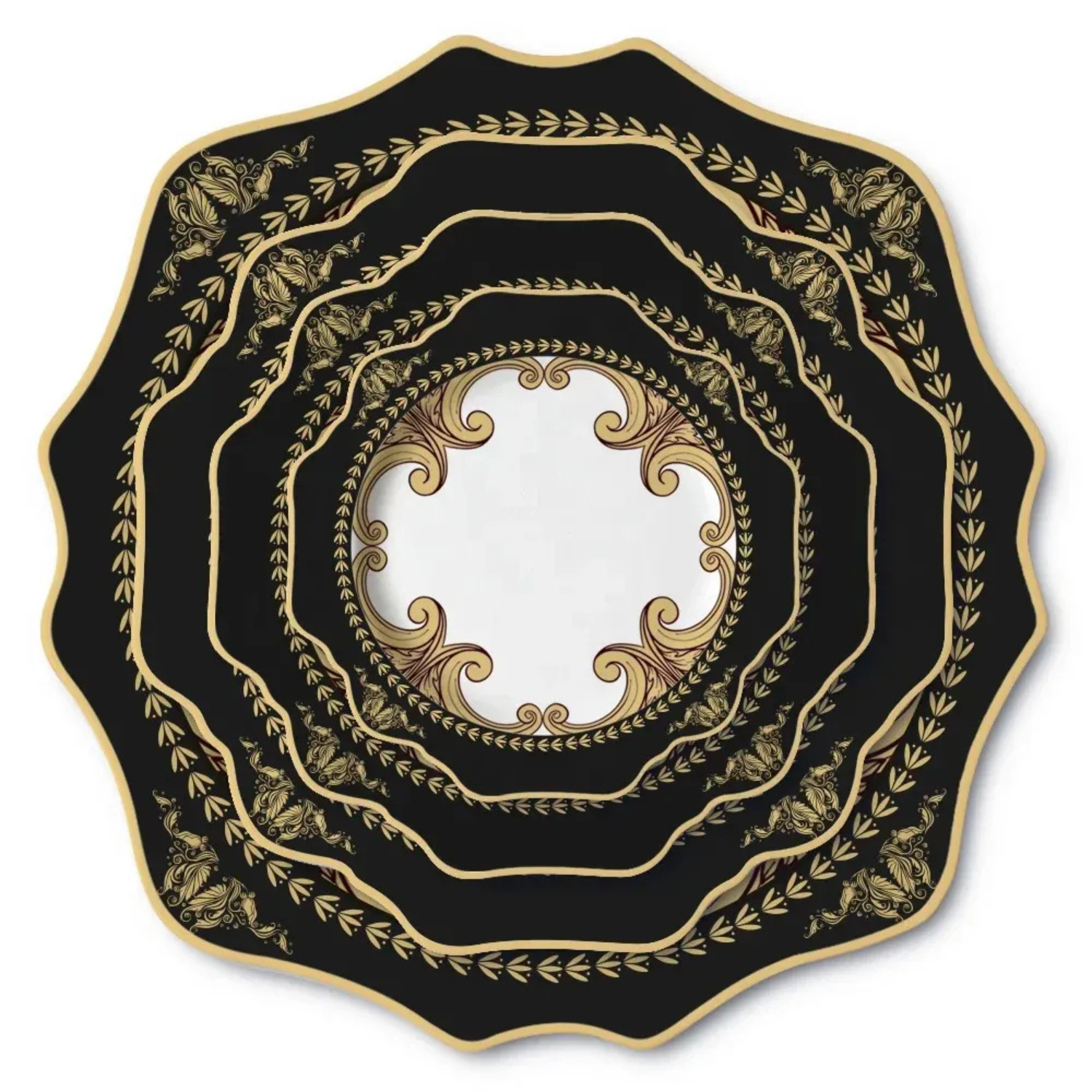 Erleben Sie außergewöhnliche Eleganz mit dem Luxuriösen Schwarz-Gold Sonnenblumen Bone China Geschirrset (4-teilig). Dieses exklusive Service verbindet tiefes Schwarz mit strahlenden goldenen Sonnenblumen und schafft so einen unverwechselbaren, luxuriösen Look. Gefertigt aus 45 % Bone Ash, überzeugt das Geschirr durch Leichtigkeit, Glanz und Langlebigkeit. Die kunstvollen Goldverzierungen reflektieren das Licht auf elegante Weise und verleihen jedem Anlass einen festlichen Charakter. Perfekt für Hochzeiten, Dinnerpartys, Restaurants oder als edles Geschenkset – dieses Geschirr bringt Stil und Klasse auf jeden Tisch. Das Set umfasst: Platzteller (30 cm), Essteller (26,7 cm), Dessertteller (20,3 cm) und Brotteller (16,5 cm). Spülmaschinengeeignet im Schonwaschgang, nicht für Mikrowelle oder Backofen geeignet.