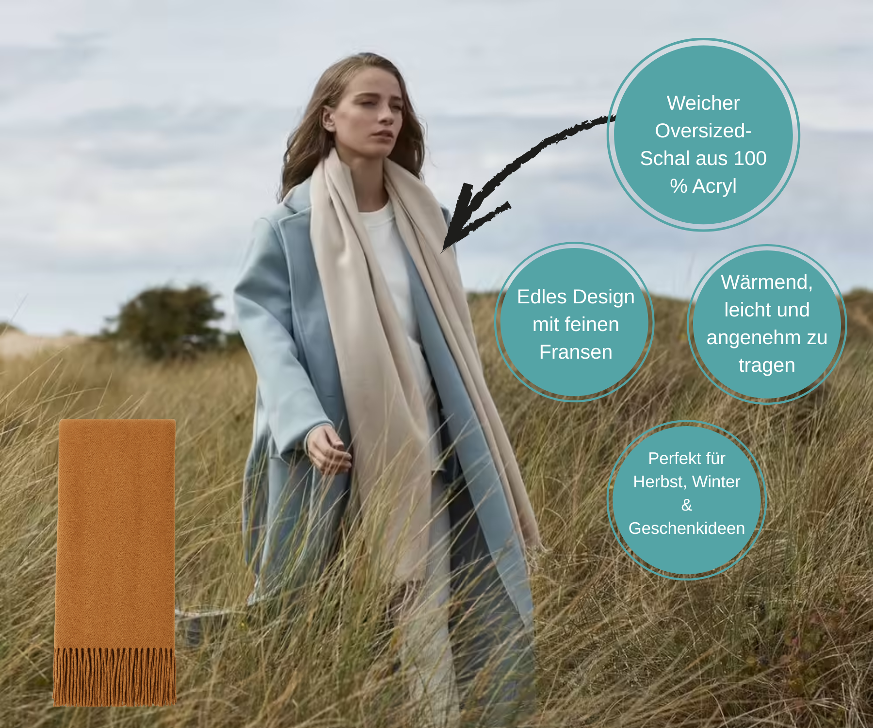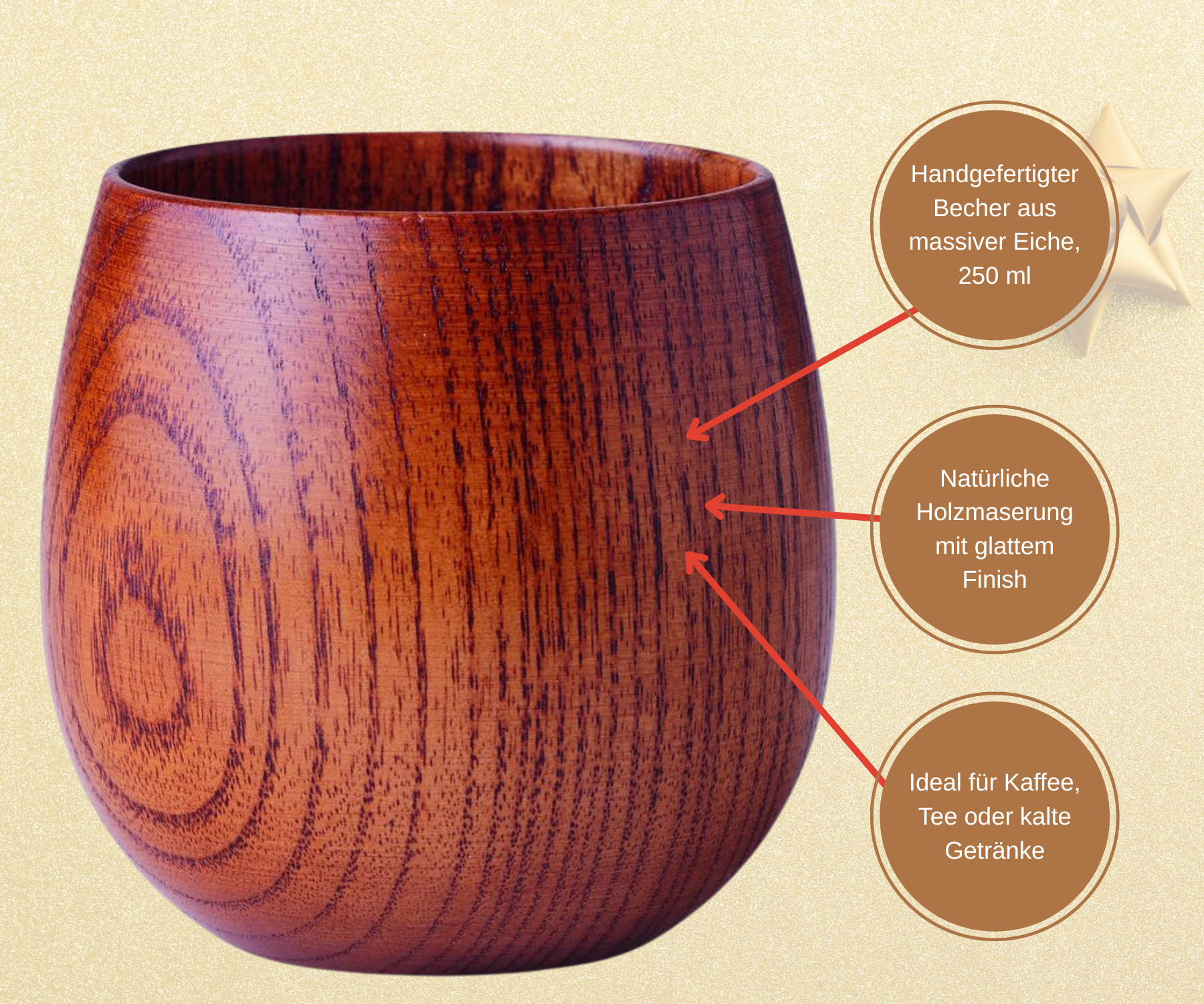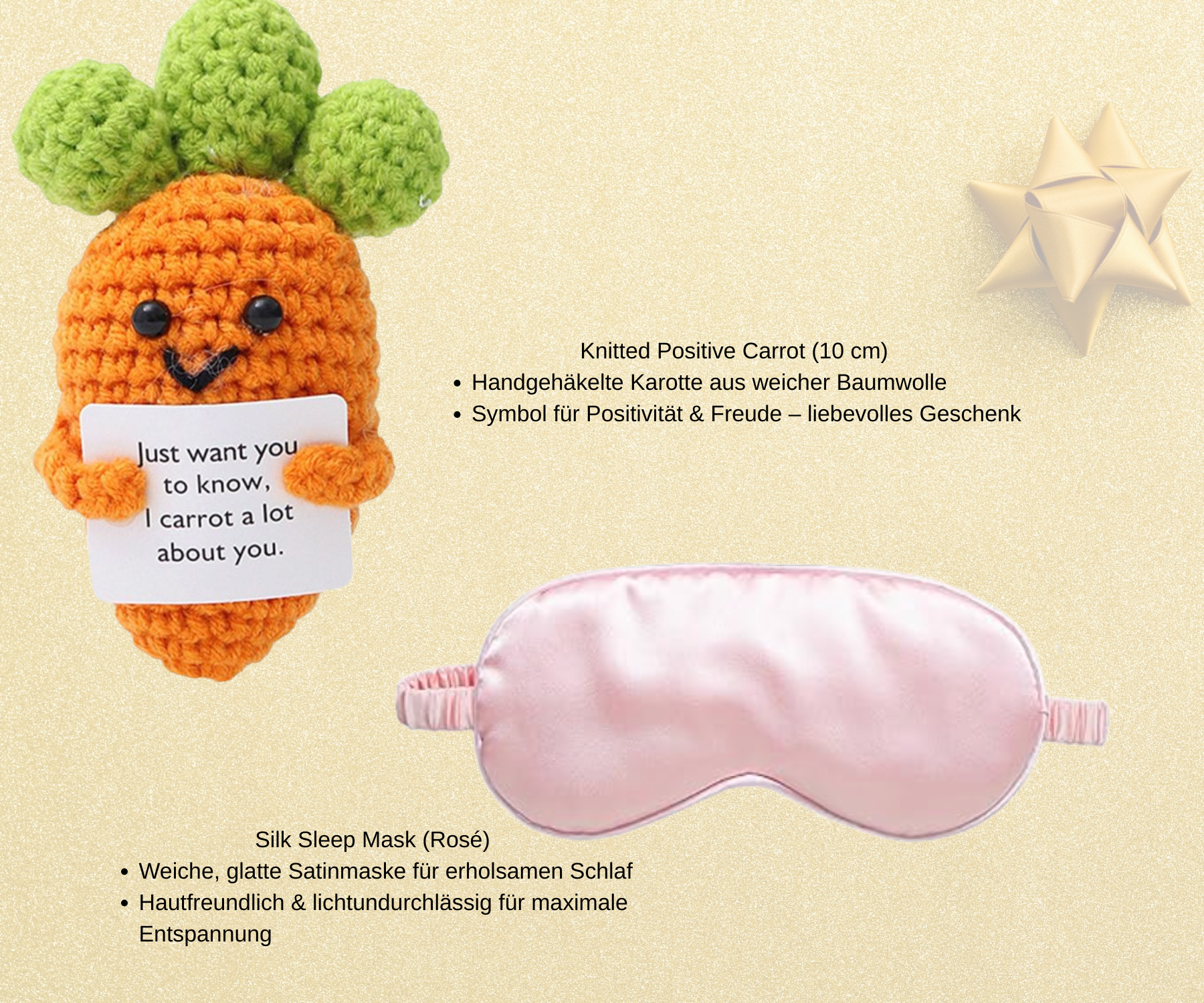Der weiche Schal in klassischem Camel-Ton sorgt für behagliche Wärme, während die handgegossene Duftkerze mit natürlichem Sojawachs einen sanften, beruhigenden Duft entfaltet. Die feine Satin-Schlafmaske fördert erholsamen Schlaf, während die edle Armbanduhr in Rotgold-Ton und der handgefertigte Holzbecher den Look vollenden. Als charmantes Detail rundet das gehäkelte Karotten-Maskottchen das Geschenk mit einem Hauch von Freude ab.
