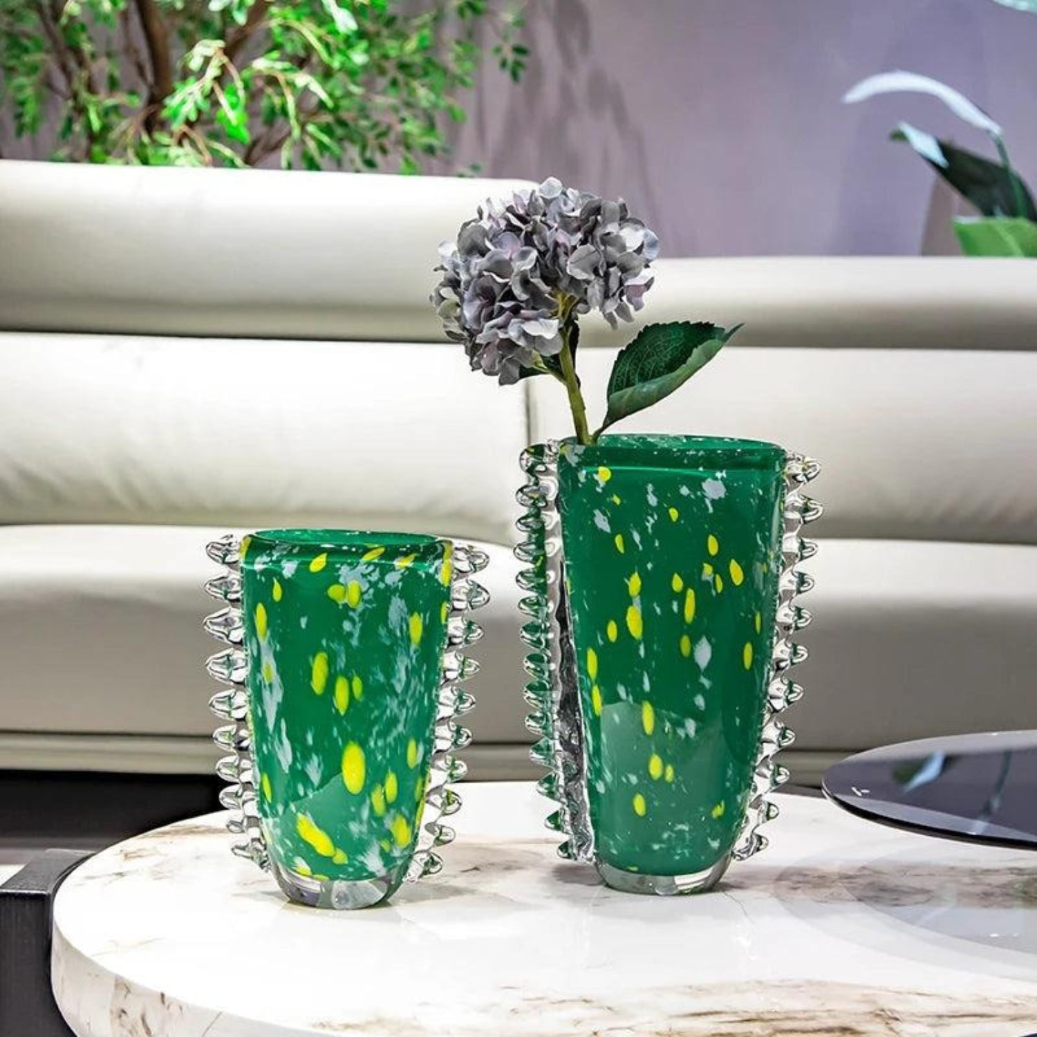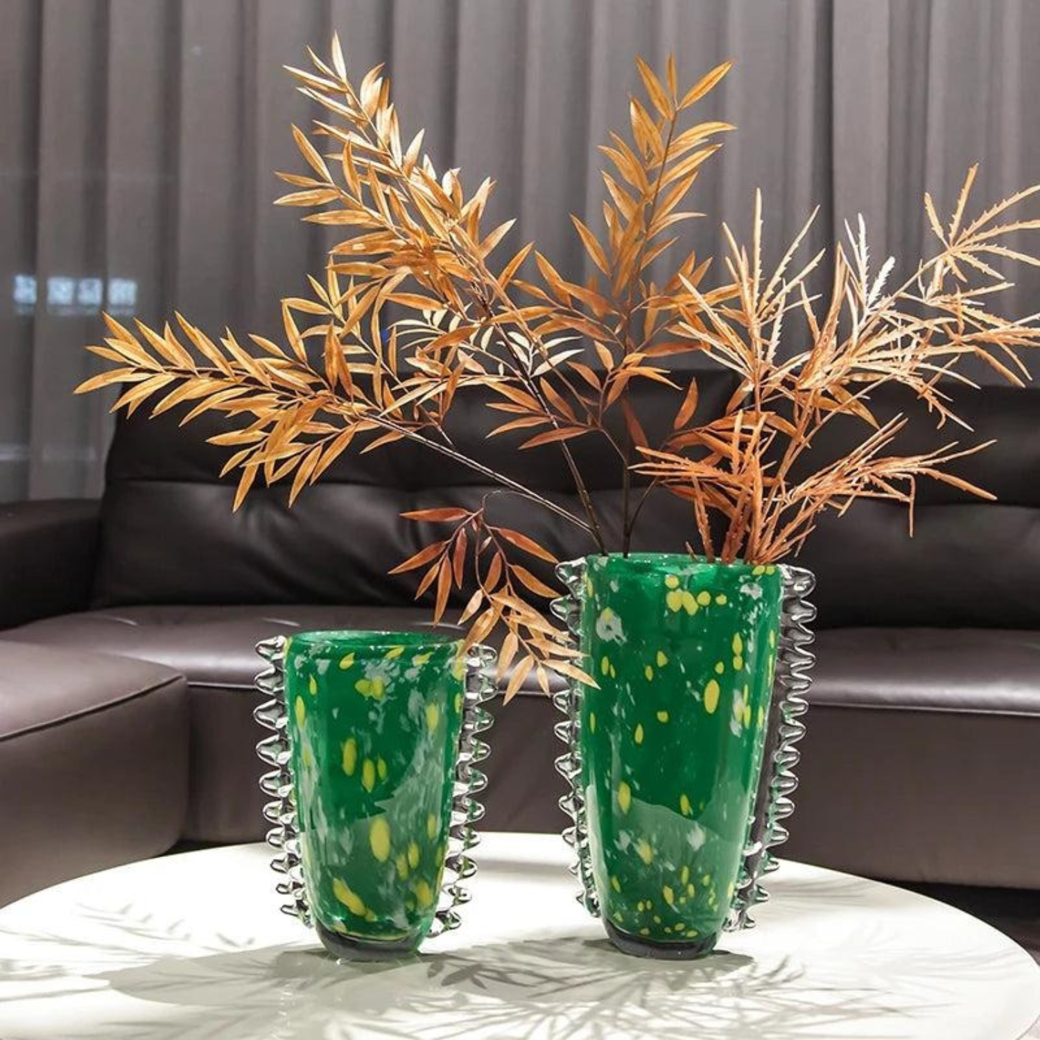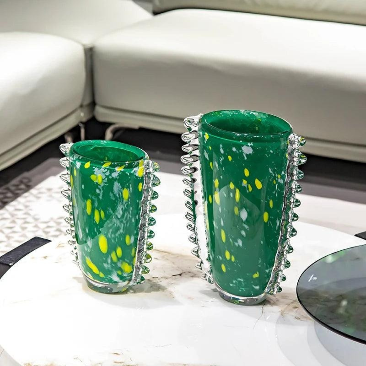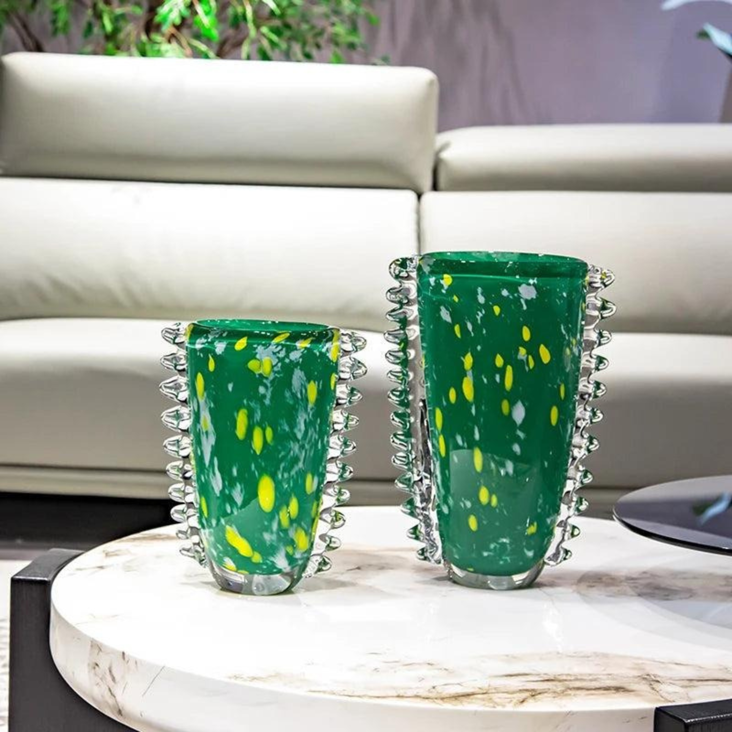 Das Luxus-Set Handgefertigter Grüner Glasvasen ist ein ausdrucksstarkes Kunstwerk moderner Glaskunst. Jedes Stück ist mundgeblasen und besticht durch seine kräftige grüne Grundfarbe mit kunstvollen gelb-weißen Akzenten. Die seitlich gearbeiteten Glasdetails verleihen der Vase Tiefe und Struktur, während das dickwandige Glas Stabilität und hochwertigen Glanz bietet. Ob als Centerpiece, Blumenvase oder dekoratives Einzelstück – dieses Set bringt Farbe, Kreativität und luxuriöse Handwerkskunst in Ihr Interieur. Ideal für Wohnzimmer, Essbereiche oder stilvolle Hotellobbys.