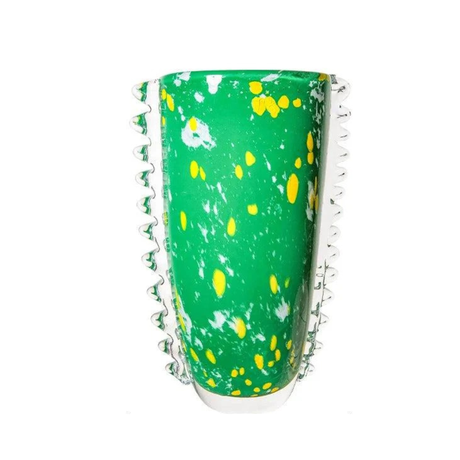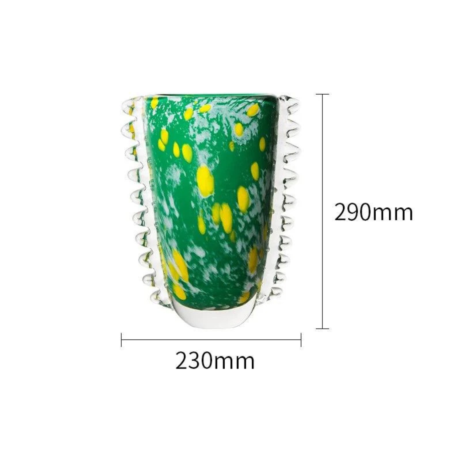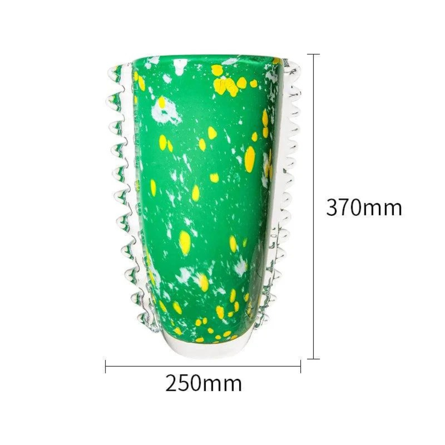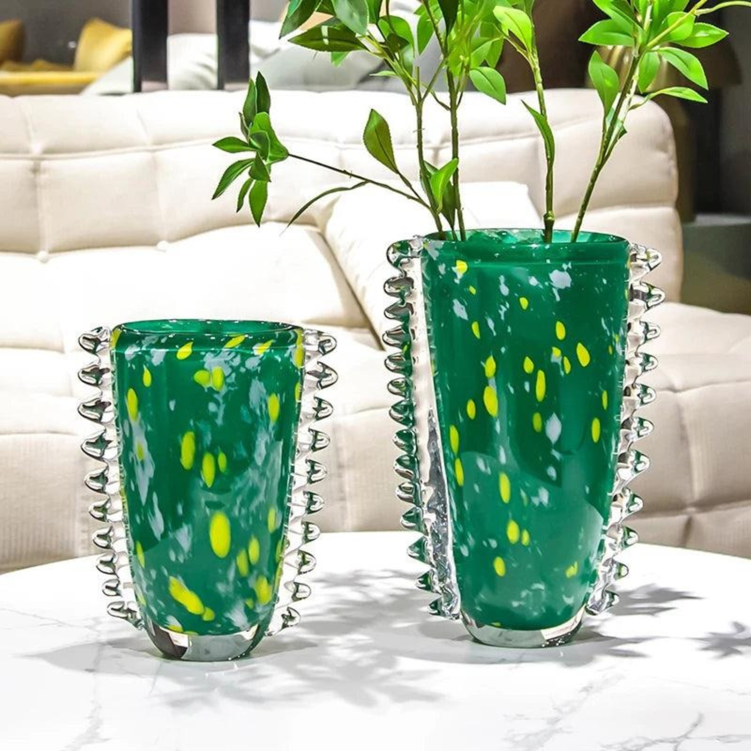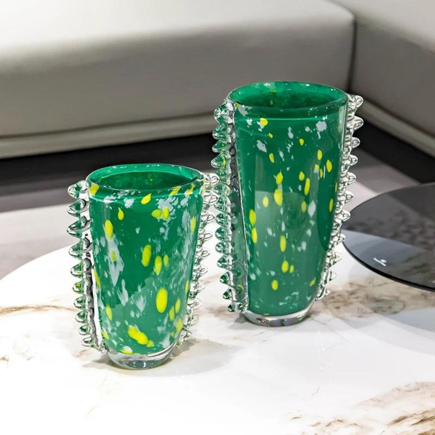 Das Luxus-Set Handgefertigter Grüner Glasvasen ist ein ausdrucksstarkes Kunstwerk moderner Glaskunst. Jedes Stück ist mundgeblasen und besticht durch seine kräftige grüne Grundfarbe mit kunstvollen gelb-weißen Akzenten. Die seitlich gearbeiteten Glasdetails verleihen der Vase Tiefe und Struktur, während das dickwandige Glas Stabilität und hochwertigen Glanz bietet. Ob als Centerpiece, Blumenvase oder dekoratives Einzelstück – dieses Set bringt Farbe, Kreativität und luxuriöse Handwerkskunst in Ihr Interieur. Ideal für Wohnzimmer, Essbereiche oder stilvolle Hotellobbys.
