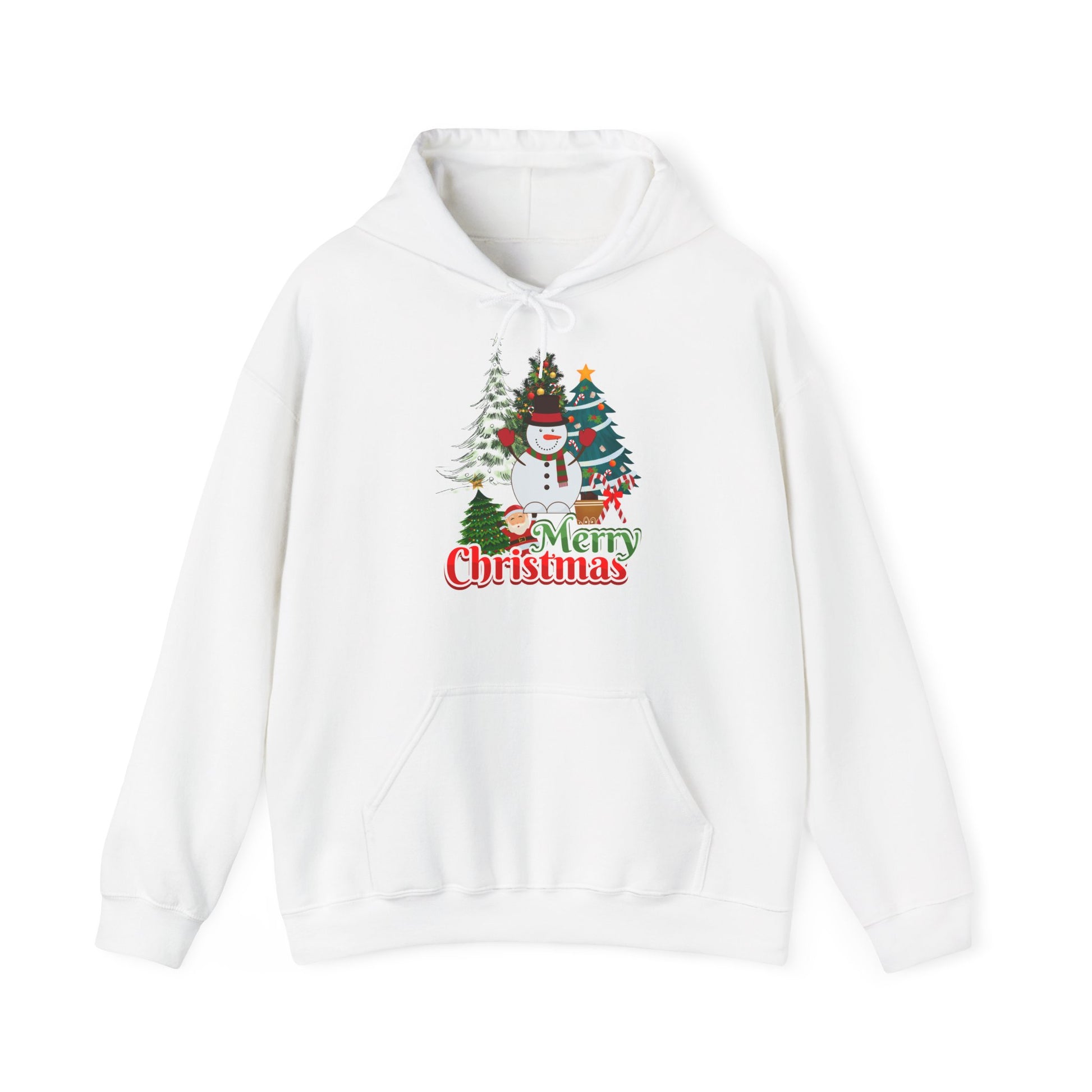 Bringen Sie festliche Stimmung in die kalte Jahreszeit mit diesem Merry Christmas Hoodie. Das liebevolle Motiv zeigt einen fröhlichen Schneemann mit geschmückten Weihnachtsbäumen, Santa Claus und Zuckerstangen – ein Design, das pure Weihnachtsfreude ausstrahlt.