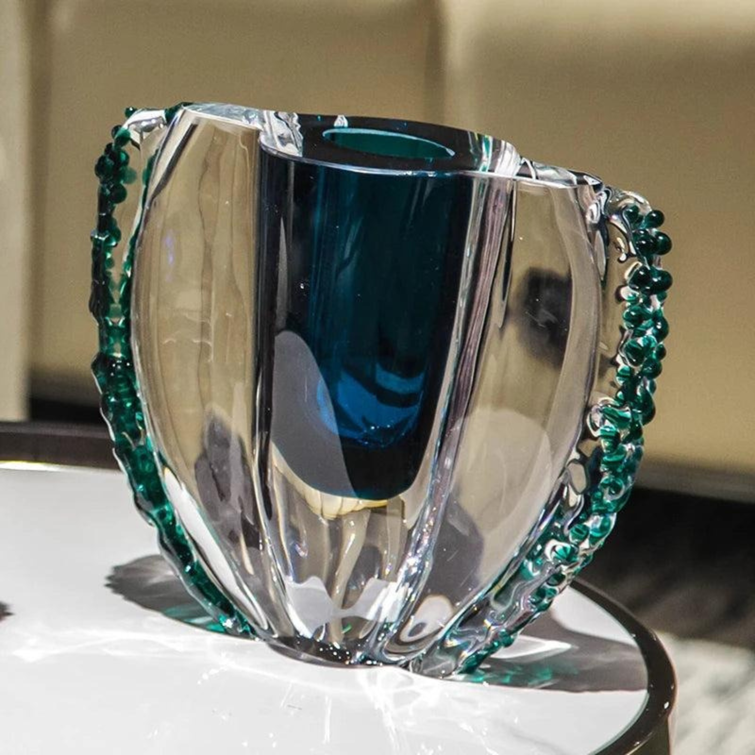 Die Moderne Luxus-Kristallskulptur im Pokalförmigen Design vereint Eleganz, Ausdruckskraft und luxuriöse Handwerkskunst. Gefertigt aus massivem, verdicktem Kristallglas, beeindruckt sie durch Tiefe, Glanz und markante Farbgebung in Smaragdgrün oder Rubinrot. Das außergewöhnliche Design macht sie zu einem Statement-Stück moderner Raumgestaltung – ideal für Schreibtische, Sideboards oder als stilvolle Dekoration im Wohnzimmer. Jede Skulptur ist handgefertigt und überzeugt durch ihre Balance aus künstlerischem Anspruch und hochwertiger Verarbeitung.