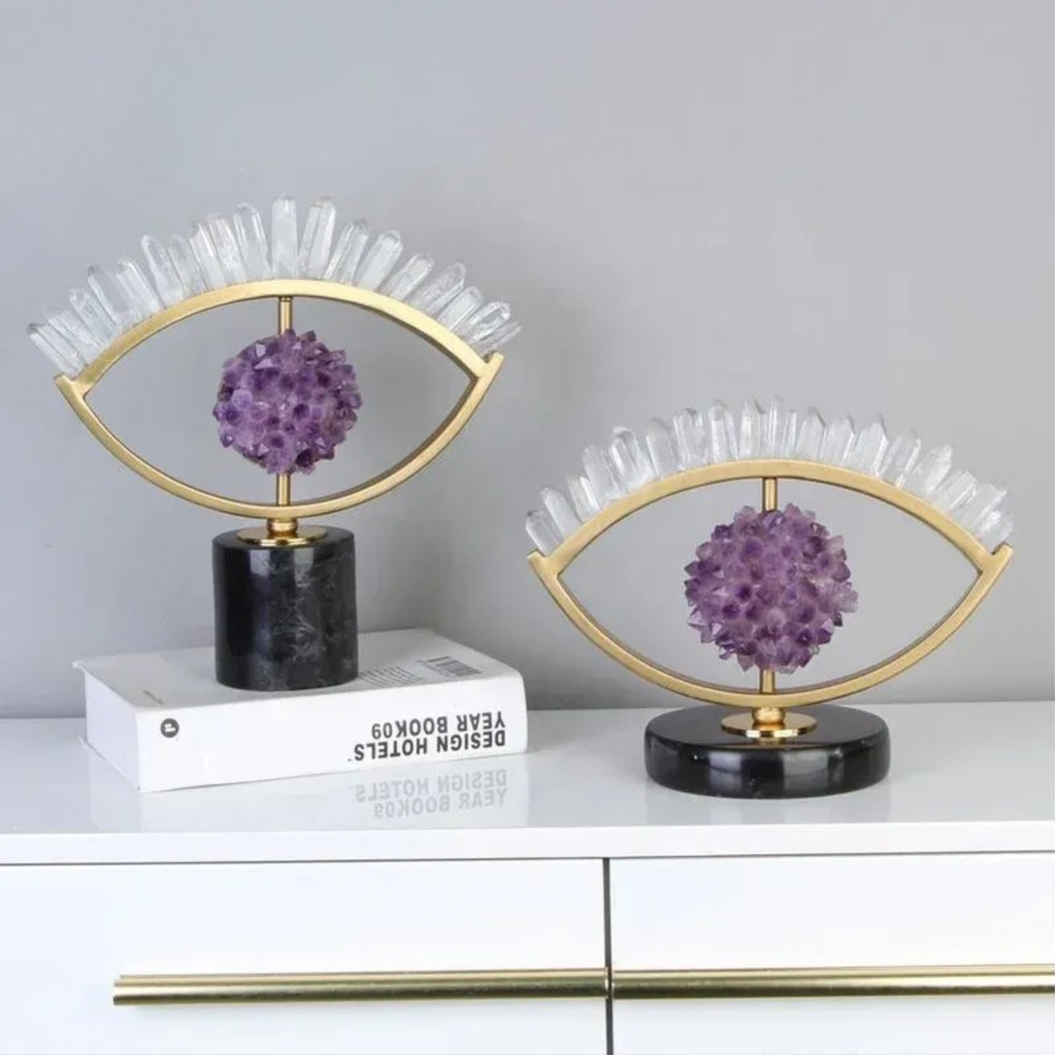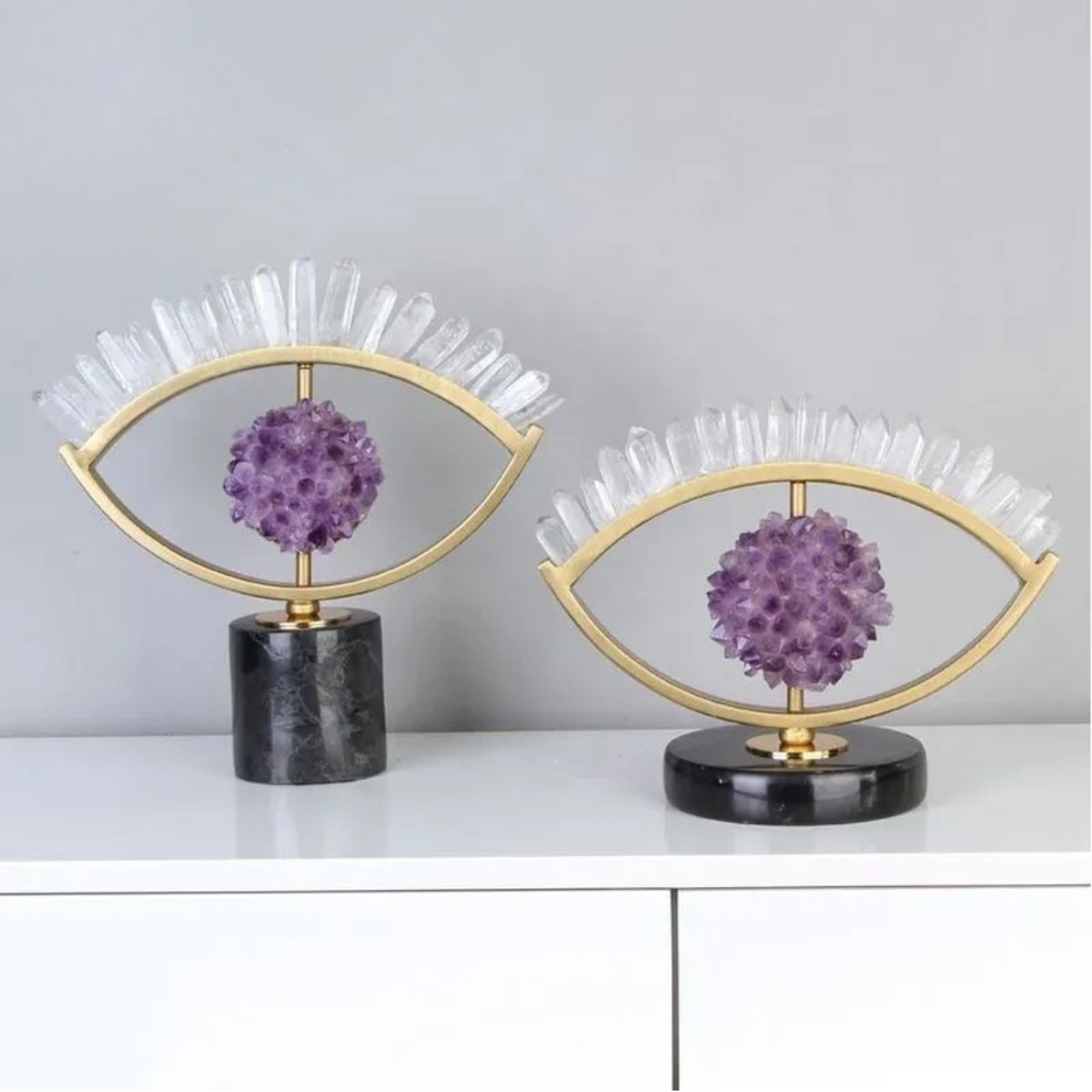 Verleihen Sie Ihrem Raum eine aura von Luxus und Energie mit diesem außergewöhnlichen 2er Set Amethyst Dekofiguren in Augenform. Jede Skulptur ist ein Meisterwerk aus echtem Amethyst, Kristallglas und vergoldetem Metall, kunstvoll platziert auf einer edlen Marmor-Basis.