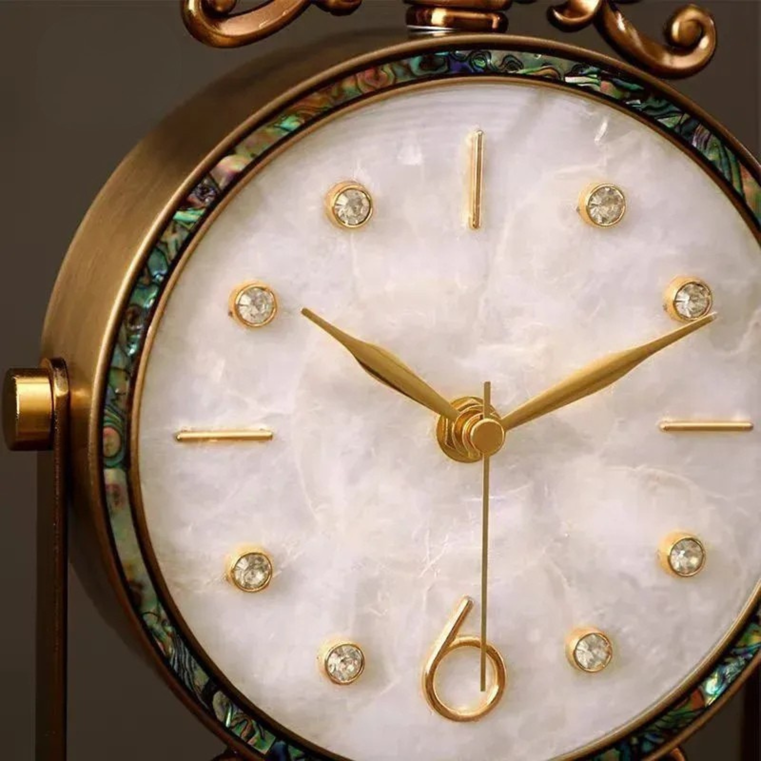 Diese elegante europäische Retro Tischuhr kombiniert klassischen Stil mit luxuriöser Handwerkskunst. Gefertigt aus vergoldetem Messing, Glas und Perlmutt-Einsätzen, strahlt sie eine zeitlose Schönheit aus, die an antike Palastdekoration erinnert.